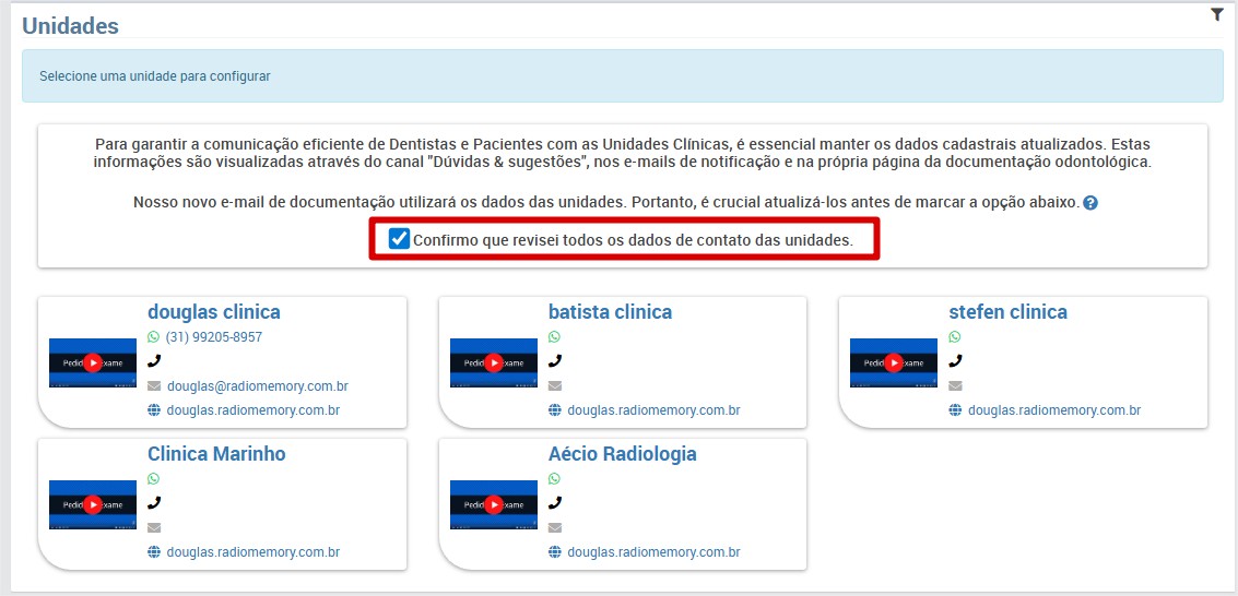 - Em “Unidades”, escolha a unidade que deseja configurar, caso seja uma clínica com múltiplas unidades.